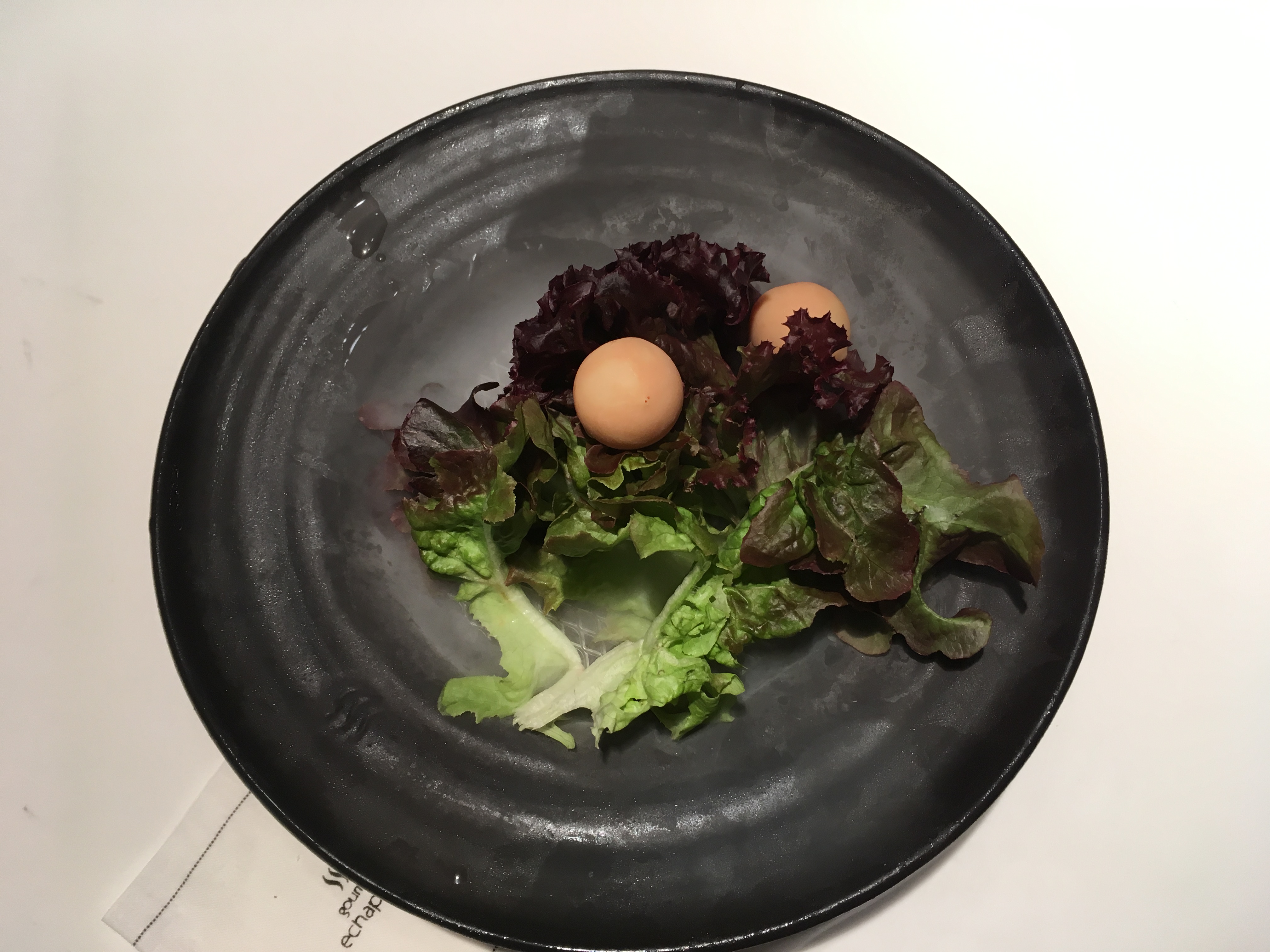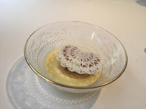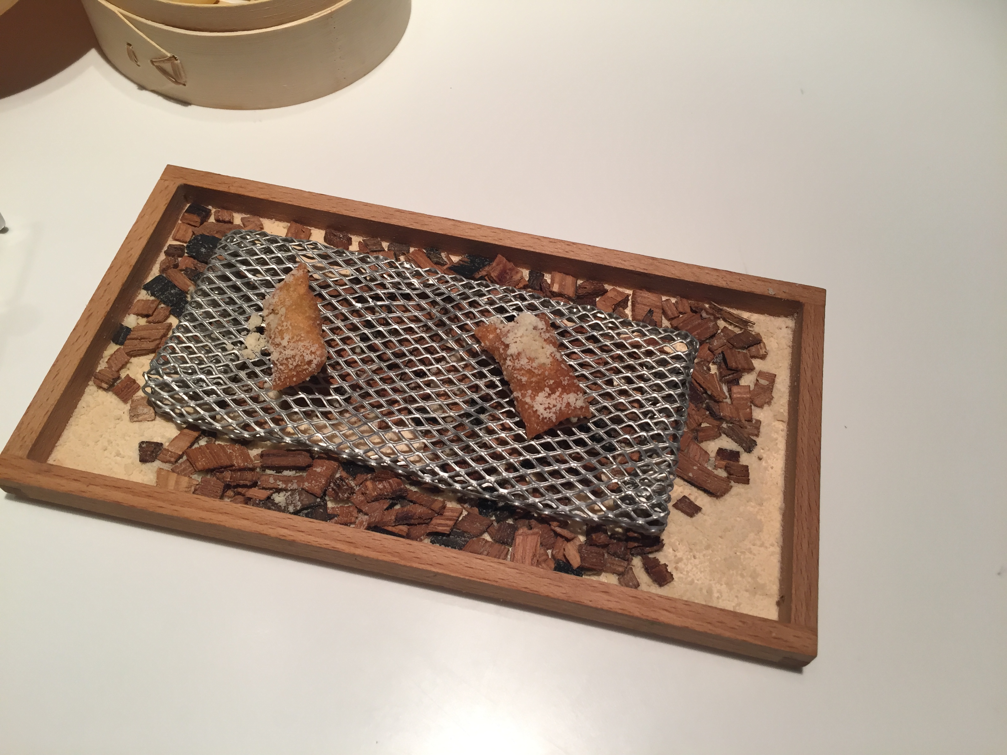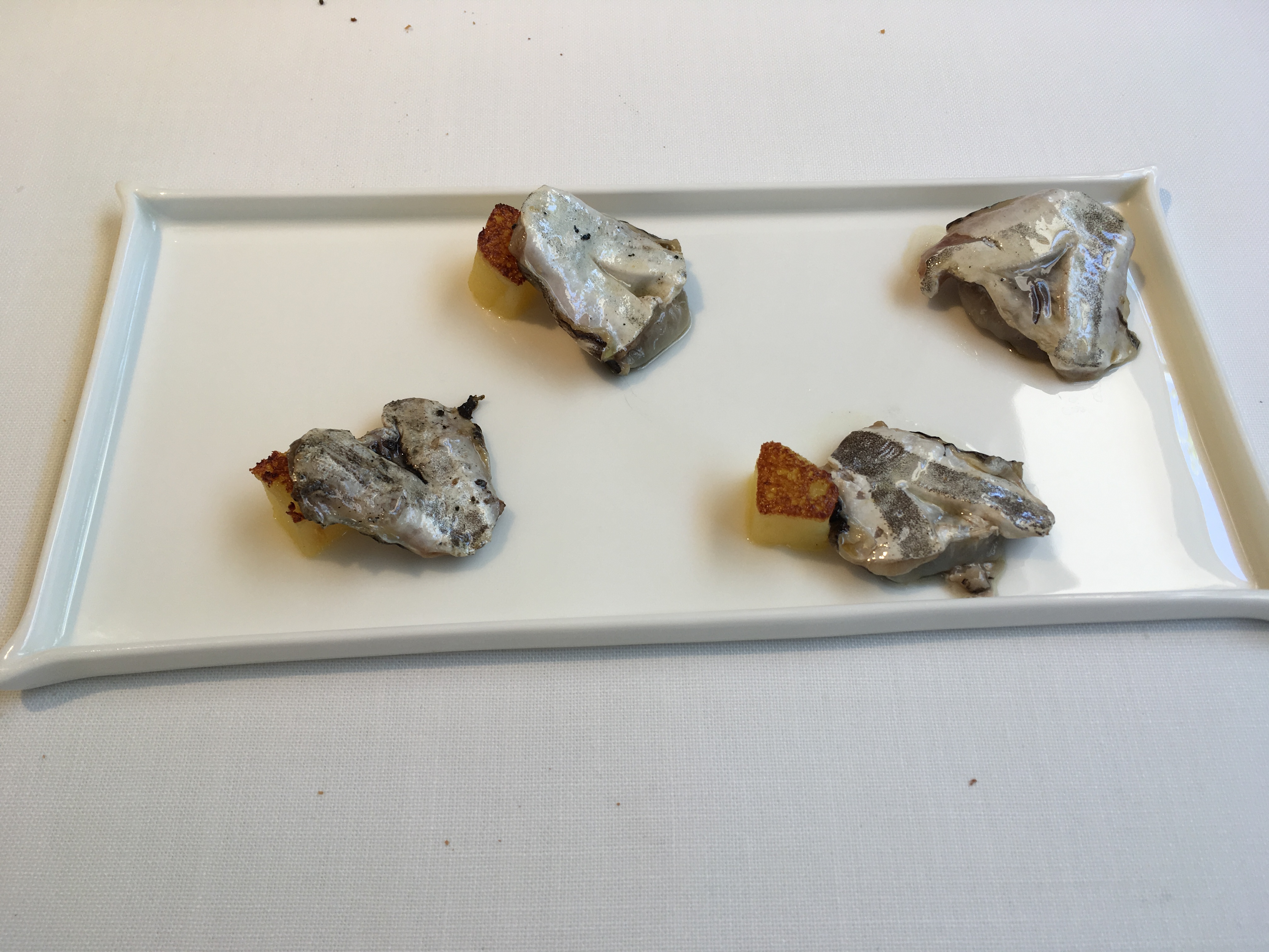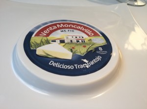 Los aperitivos, no lo hemos contado, fueron unos fardelejos salados relleno de coliflor, un brioche (quizás lo más flojo de todo el menú), unas bolas de salmorejo y unos pimientos, que llegan bajo la denominación de “bocados de huerta”. En mesa llega el último aperitivo, un trampantojo (una trampa para los ojos) que asemeja ser una caja de quesitos El Caserío, pero que en realidad son porciones de algo parecido a una brandada de bacalao.