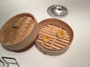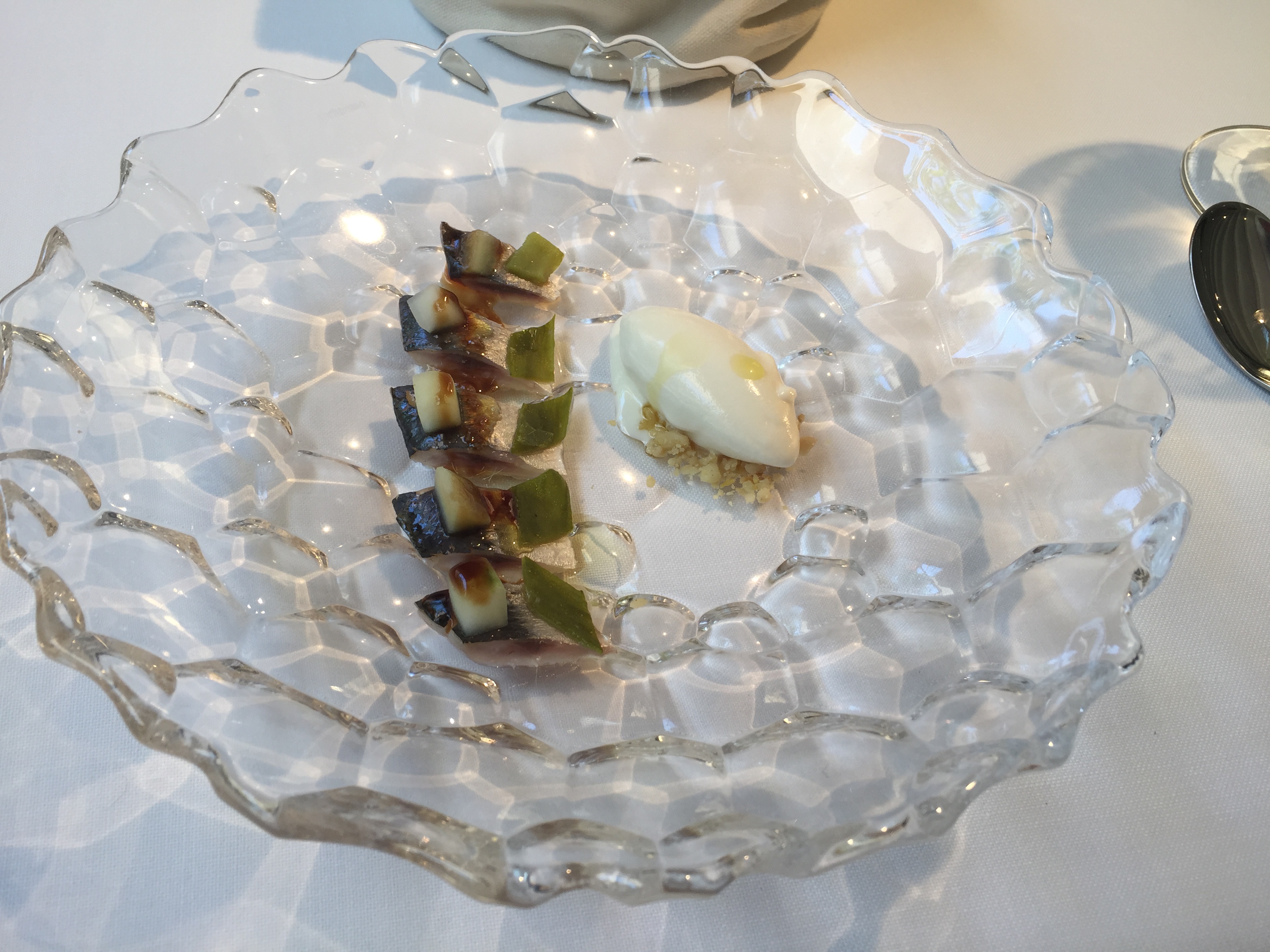 Tras los aperitivos, ya en la mesa, se inicia el menú degustación. Elegimos el clásico al precio de 70 euros por comensal y que incluye pan y agua. Se le puede añadir un maridaje por otros 35 euros.