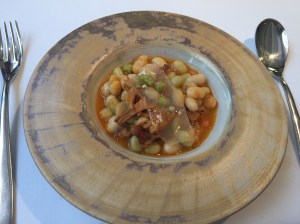 Sigue una sardina con crema de ajoblanco y verduras. Espectacular. Siguió unas vieiras a la plancha sobre hortalizas, unas alubias pochas con setas y papada de ibérico, unas cocochas de merluza asadas al sarmiento y un lomo de cordero lechal con lecherillas. Por no repetir digamos que todo casi de diez (o de once sobre diez).